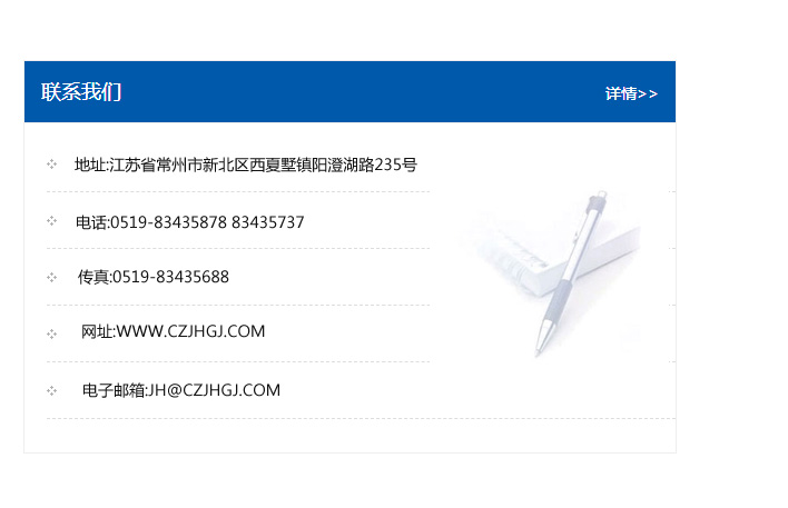 地址:常州市新北區友邦商務大廈1幢16、17層  電話:0519-85101652  傳真:0519-85112595  郵編:213022  網址:www_cz-jiayue_cn.tjjinsanyou.com  郵箱:xiajifengaa@163.com